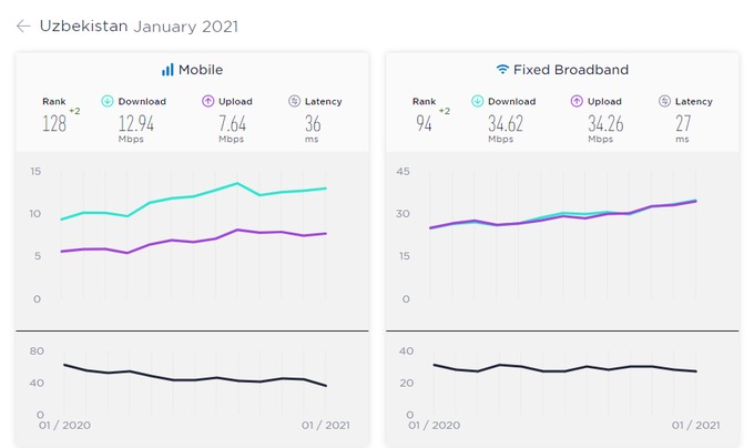 Ookla kompaniyasi Speedtest.net servisi 2021 yil yanvar oyi natijalariga oid yangi ma’lumotlarni e’lon qildi. Unga ko‘ra, O‘zbekistonda aniqlangan va mobil Internet tezligi bo‘yicha o‘sish qayd etildi.