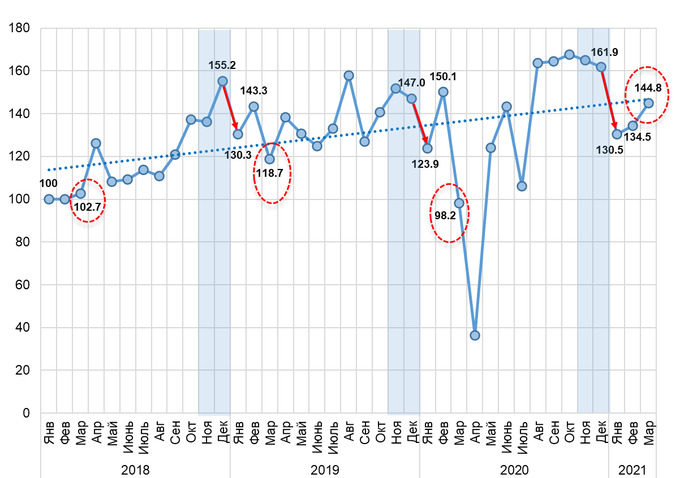 Mart oyida avtomobil bozorida aholi talabi fevral oyiga nisbatan 7,7%ga oshib, qatorasiga ikkinchi oy barqaror o‘sish sur’atlarini ko‘rsatdi. 2020 yil mart oyi bilan taqqoslaganda avtomobillar savdosi o‘sishi 47,4%ni tashkil qildi. 2020 yil mart oyida respublika bo‘yicha joriy etilgan lokdaun natijasida savdolar fevral oyiga nisbatan 34,6%ga kamaygan edi.