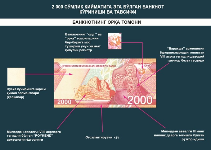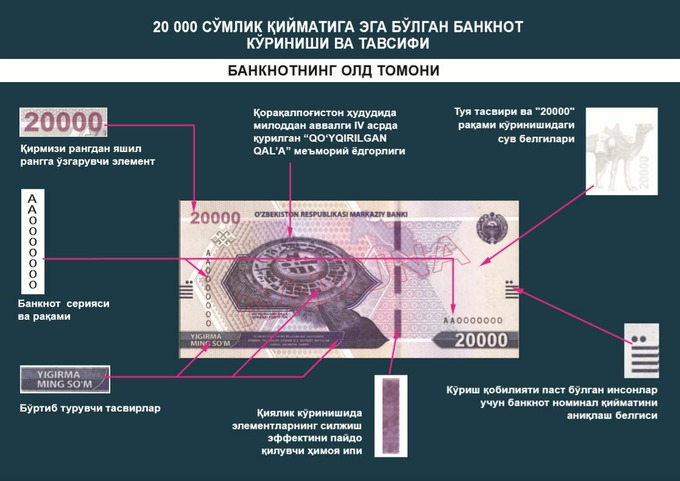 Shuningdek, Markaziy bank xabarida muomalaga chiqarilayotgan qiymati 2 000 soʻm va 20 000 soʻm boʻlgan pul belgilari ayni paytda muomalada boʻlgan pul belgilari va tangalar bilan bir qatorda barcha xoʻjalik yurituvchi subyektlar va aholi tomonidan oʻz qiymati boʻyicha barcha turdagi toʻlovlar uchun hech qanday cheklovlarsiz qabul qilinishi shartligi taʼkidlangan.