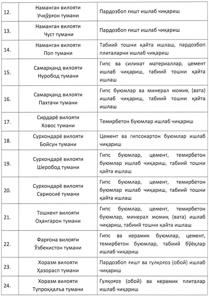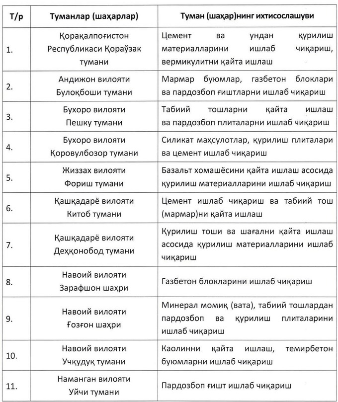 Qurilish materiallari ishlab chiqarishga ixtisoslashtiriladigan tumanlar (shahar) roʼyxati