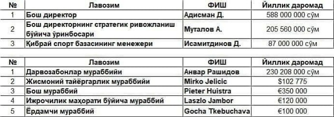 “Paxtakor"ning murabbiylar shtabi esa umumiy miqdorda yiliga 8 milliard 525 million so‘m ajratiladi. Shuning yarmidan ko‘pi (4,42 mlrd so‘m) bosh murabbiy Piter Hyuistraga tegadi.