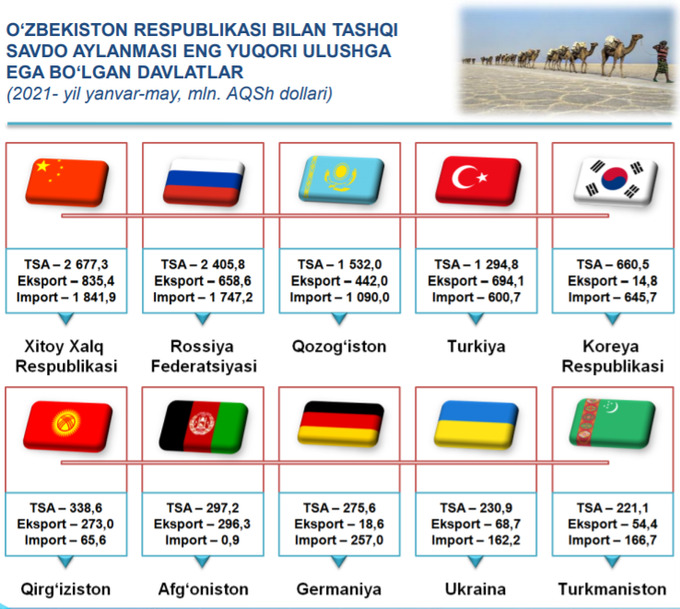 Davlat statistika qoʻmitasining xabar berishicha, 2021-yilning yanvar-may oylari yakuni bilan respublikaning tashqi savdo aylanmasi $14,5 mlrd ni tashkil etib, 2020-yilga nisbatan $1,7 mlrd ga yoki 13,2% ga koʻpaydi.