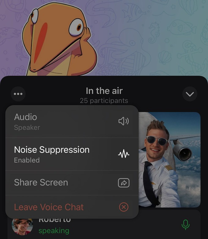 Telegram ovozli chatlarni hatto taom tanovul qilayotganda ham ovoz tiniq va ravshan eshitilishi uchun shovqinsizlantirish tizimini yaxshiladi. Shuningdek, zarur boʻlganda sozlamalarda shovqinsizlantirishni faolsizlantirish ham mumkin.