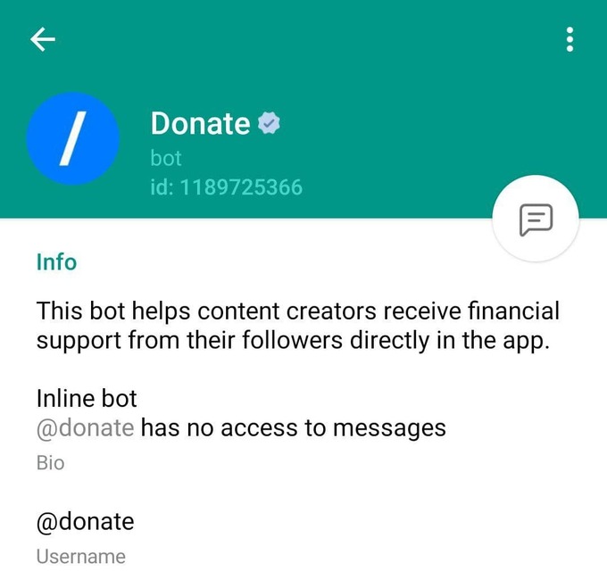 Ogoh boʻlish kerakki, Donate botida Telegramning koʻk rangli rasmiy belgisi bor, shu orqali uni oʻxshash nomdagi boshqa botlardan farqlash mumkin.
