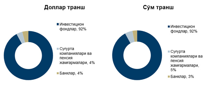 Shakllangan buyurtmalar hajmi va moliyaviy konsultant-anderrayterlarning tahlillaridan kelib chiqib, London vaqti bilan soat 13:00da dollar va so‘mdagi obligatsiyalar uchun foiz stavkalari, mos ravishda, 4,125% va 14,25−14,5%ga tushirildi.