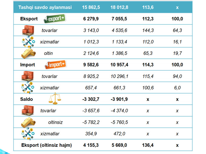 Oʻtgan yilning tegishli davriga nisbatan eksport 12,3% ga oʻsib, $7 055,5 mln ga, import esa 14,3% ga oshib, $10 957,4 ga yetgan.