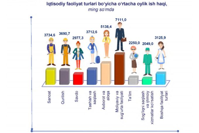 Qayd etilishicha, oʻrtacha oylik ish haqining eng yuqori darajasi moliyaviy va sugʻurta iqtisodiy faoliyatida — 7 mln 111 ming soʻm yoki respublika koʻrsatkichidan (2 mln 971 ming soʻm) 2,4 barobar yuqori ekanligi aniqlandi.