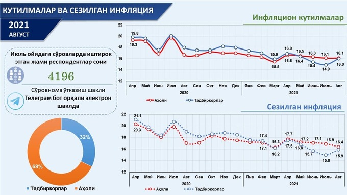 Aholining inflyatsiya boʻyicha kutilmalari 16%, biznesning kutilmalari esa 16,1% ni tashkil etgan. Iyul oyida esa bu koʻrsatkich, biznesda 14,9, aholida esa 16,1% boʻlgan.