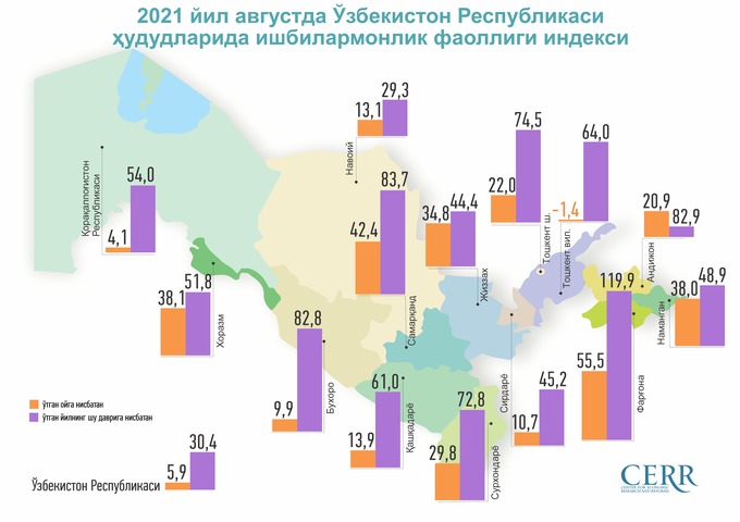 Iqtisodiy tadqiqotlar va islohotlar markazi tomonidan baholangan ishbilarmonlik faolligi indeksi (IFI) 2021-yil avgust oyida 1059 birlikni tashkil etib, oʻtgan oyga nisbatan 5,9% ga, oʻtgan yilning mos davriga nisbatan esa 30% lik oʻsishni qayd etgan.