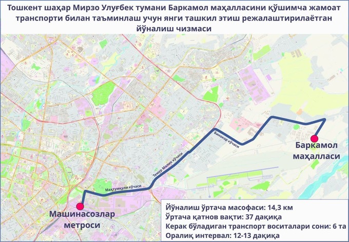 “Mashinasozlar” metro bekatidan Mirzo Ulug‘bek tumanidagi Barkamol mahallasigacha. Yo‘nalish masofasi — 14,3 kilometr;