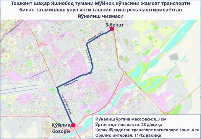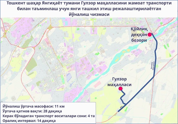 Qayd etilishicha, Toshkent shahar transport boshqarmasiga kelib tushayotgan murojaatlar tahlil qilinib, jamoat transportiga ehtiyoji mavjud hududlar kesimida yangi yo‘nalish chizmalari ishlab chiqilgan.