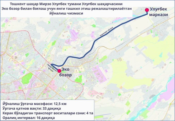 Mirzo Ulug‘bek tumanidagi “Eko bozor"dan Mirzo Ulug‘bek tumanidagi Ulug‘bek shaharchasigacha. Yo‘nalish masofasi — 12,5 kilometr.