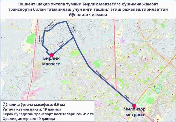 “Chilonzor” metro bekatidan Uchtepa tumanidagi Birlik mavzesigacha. Yo‘nalish masofasi — 6,9 kilometr;