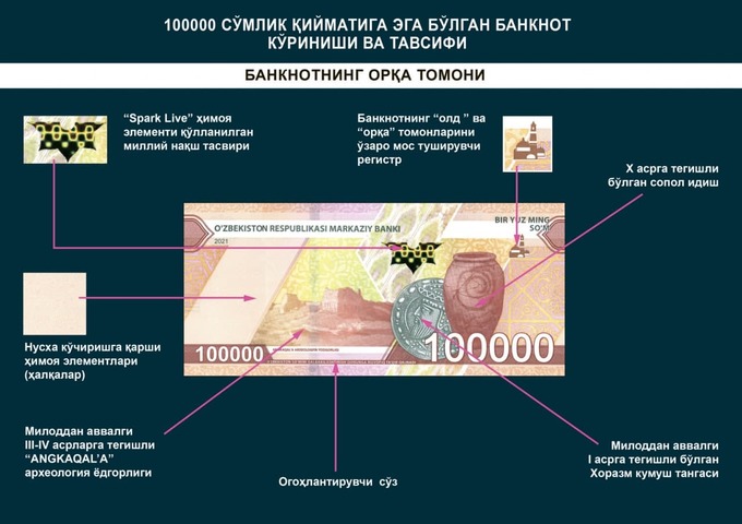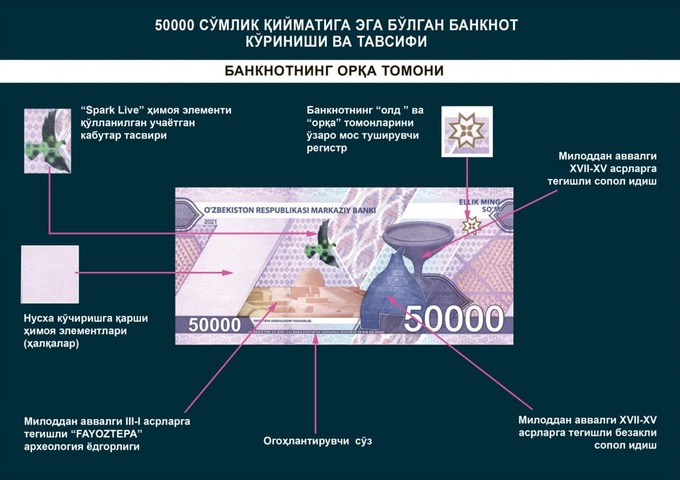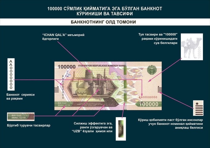 Markaziy bank xabariga koʻra, yangi koʻrinishdagi 50 ming va 100 ming soʻmlik kupyuralar 2021-yilning 22-dekabridan boshlab muomalaga chiqariladi. Hozir amalda boʻlib turgan 2017-yilda chiqqan 50 ming soʻmlik va 2019-yilda chiqqan 100 ming soʻmlik banknotlar ham muomaladan chiqarilmaydi va ular oʻz toʻlov qobiliyatini saqlab qoladi.