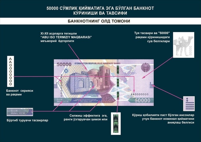 Yangi koʻrinishdagi nominal qiymati 50 000 soʻm va 100 000 soʻm boʻlgan banknot shaklida pul belgilarini muomalaga chiqarilishi toʻgʻrisida qaror qabul qilindi.
