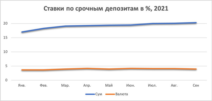Noyabr oyida soʻmdagi depozitlar boʻyicha oʻrtacha stavka 20,5 foizgacha oshdi. Shu bilan birga, xorijiy valyutadagi depozitlar boʻyicha oʻrtacha foizlar birdaniga 0,5 foizga oshdi. Oktyabr oyida ular 4,5% ni tashkil etdi — bu soʻnggi 12 oy ichida yangi maksimal koʻrsatkichdir.