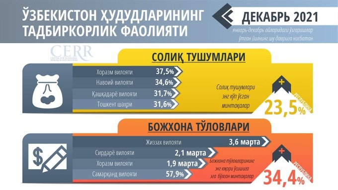 Iqtisodiy tadqiqotlar va islohotlar markazi 2021-yil uchun hududlarning ishbilarmonlik faoliyatini tahlil qildi. Unga koʻra, oʻtgan yilgi iqtisodiy oʻsish surʼati 7,4% tashkil etdi, bu avval prognoz qilingan 5−6% dan yuqori boʻldi.