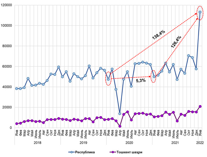 Qayd etilishicha, 2022-yil yanvar oyida 113,2 ming dona avtotransport vositalari davlat roʻyxatidan oʻtkazildi, va oʻtgan yilning yanvariga nisbatan 126,4% ga, 2020-yil yanvar oyiga nisbatan esa 138,4% ga koʻpaydi. Shu bilan birga 2021-yilning dekabriga nisbatan oʻsish surʼati 96,5% ni tashkil etdi.