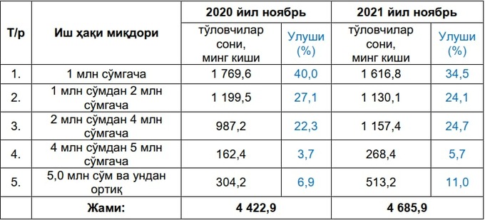 2021-yilning noyabr oyi holatiga koʻra, aholining katta qismini (34,5%) 1 mln soʻmgacha ish haqi oluvchilar tashkil etmoqda — 1 mln 616,8 ming kishi. Taqqoslash uchun, 2020-yilning noyabr oyida bu raqamlar 1 mln 769,6 ming kishiga (40%) teng boʻlgan.