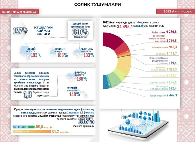 Yilning birinchi choragida budjetga soliq daromadlari 34, 495,1 mlrd so‘mni tashkil qilib, o‘tgan yilga nisbatan 17% o‘sish qayd etilgan.
