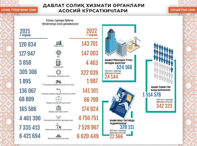 Shuningdek, deyarli barcha soliq turlari bo‘yicha soliq to‘lovchilar soni oshgan. Xususan, foyda solig‘i to‘lovchilari 22,8 mingtaga, QQS 19 ming, aylanmadan olinadigan soliq to‘lovchilari soni 16,7 mingtaga ko‘paygan.
