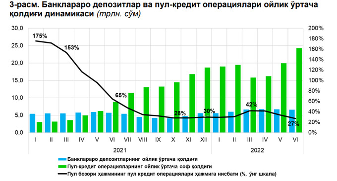 Taʼkidlash joizki, umumiy likvidlik hajmining ortib borishi bilan pul bozoridagi faollikda ham pasayish tendensiyasi kuzatildi. Xususan, aprel oyida pul bozorida 18,2 trln soʻmlik depozit operatsiyalari amalga oshirilgan boʻlsa, iyun oyida ushbu koʻrsatkich 7,7 trln soʻmgacha qisqardi.