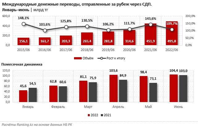 Jumladan, 2022-yilning birinchi yarmida Qozog‘istondan chet elga xalqaro pul o‘tkazmalari tizimlari orqali 495,8 mlrd tenge jo‘natildi, bu o‘tgan yilning shu davriga nisbatan 9,7 foizga ko‘pdir.