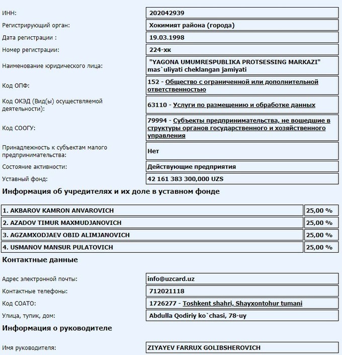Korxonalar va tashkilotlarning yagona davlat registridan “Yagona umumrespublika prosessing markazi” (UZCARD)ning 75% davlat ulushi yana xususiy qo‘llarga o‘tgani ma’lum bo‘ldi.