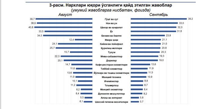 Eng top narxlar o‘sishi go‘sht va sut mahsulotlarida qayd etildi — 39,2%. Shuningdek, aholi non, un, shakar va yog‘ mahsulotlari narxida ham o‘sish sezgan.