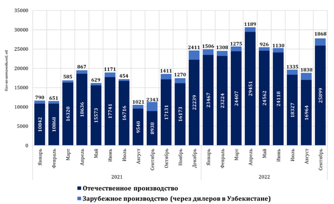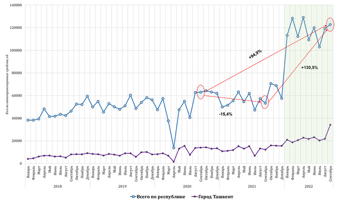 Xususan, sentabr oyida mahalliy ishlab chiqarilgan 26 mingta yangi yengil avtomobil sotilgan bo‘lib, natijada avgust oyiga nisbatan 58%ga o‘sish kuzatilgan.