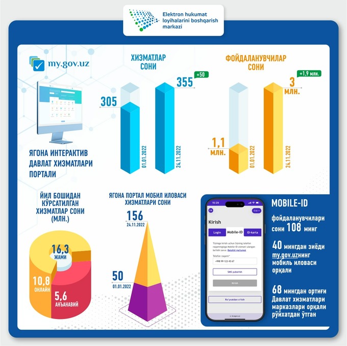 Shuningdek, Yagona portalning mobil ilovasida ham 2022-yilda 50 turdagi yangi onlayn xizmatlar joriy qilinishi, ularning sonini 156 taga yetkazdi.