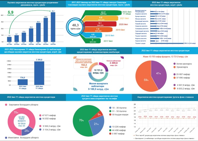 Bu davrda ipoteka kreditini olgan xotin-qizlar soni 25 807 tani tashkil etib, jami kreditlarning 41%i — 4,6 trln so‘mi ular hissasiga to‘g‘ri keladi.