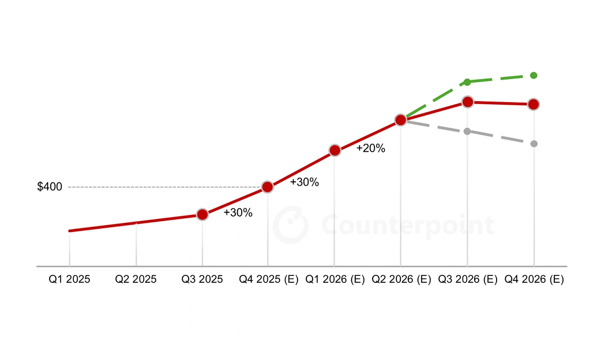 Counterpoint Research’ning hisobotiga ko‘ra, xotira narxlari 2025-yilning to‘rtinchi choragida 30% ga, keyingi yil boshida esa yana 20% ga oshishi mumkin.