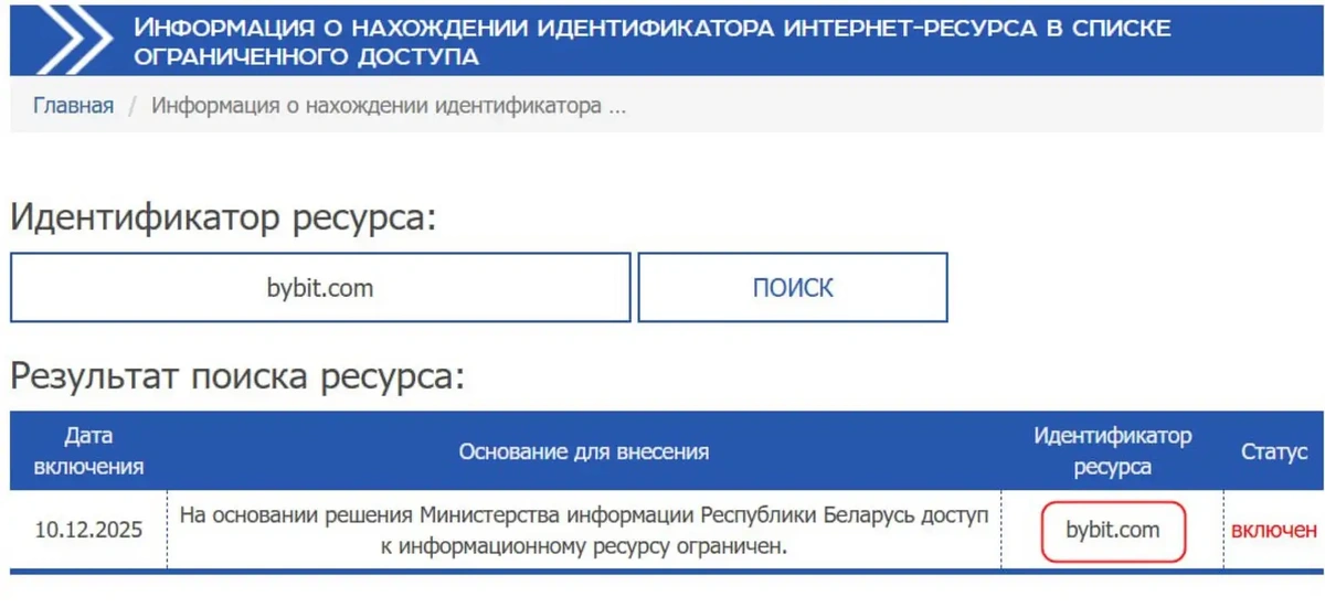 Foydalanuvchilarga resurslarni ochishga urinishda Belarus vakolatli organining qarori asosida kirish cheklanganligi to‘g‘risidagi ma’lumot ko‘rsatiladi.