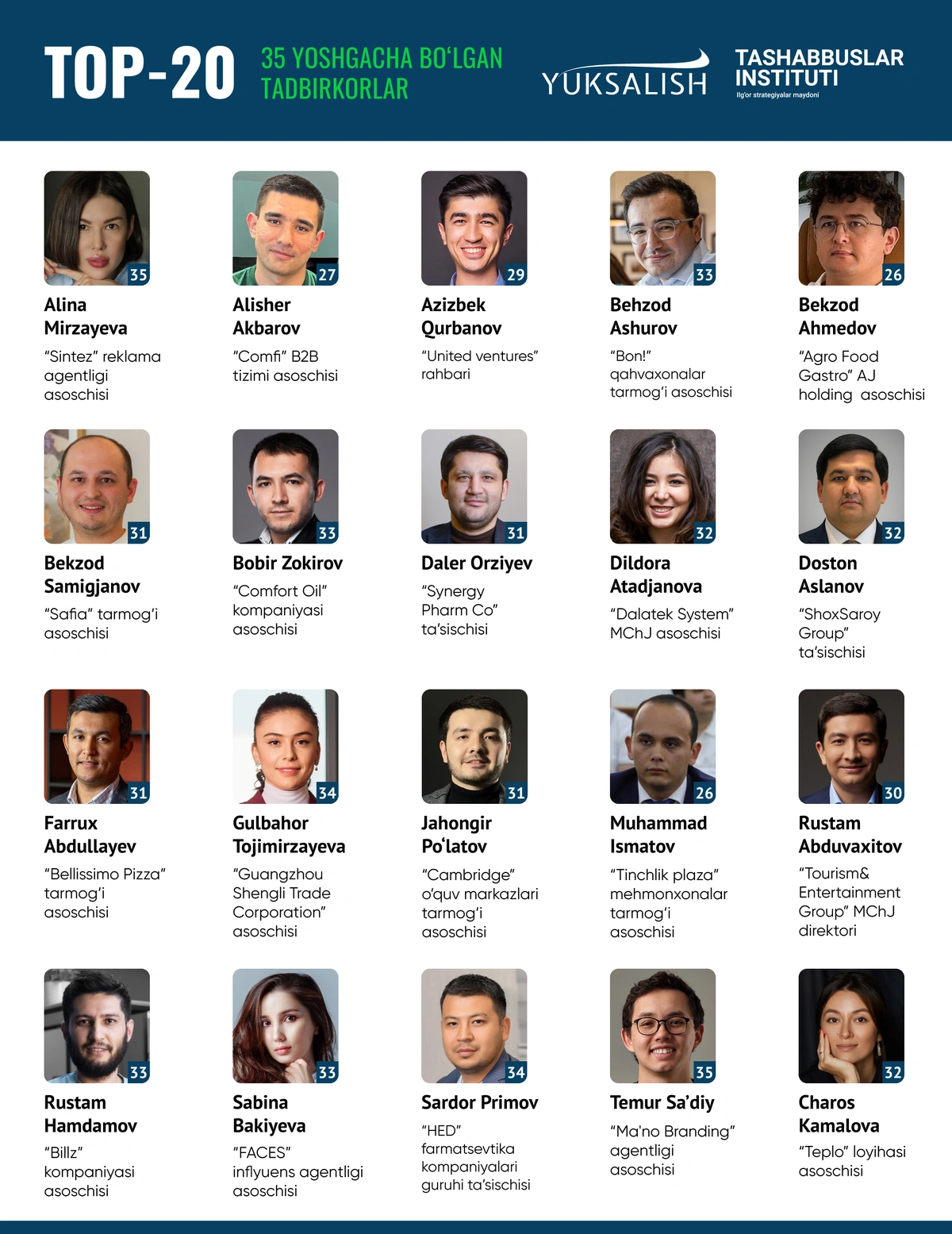 Shuningdek, ro‘yxatdan Bon! asoschisi Behzod Ashurov, Safia asoschisi Bekzod Samigjanov, Cambridge o‘quv markazlari tarmog‘i asoschisi Jahongir Po‘latov, Bellissimo Pizza tarmog‘i asoschisi Farrux Abdullayev, Billz asoschisi Rustam Hamdamov va boshqalar o‘rin olgan.