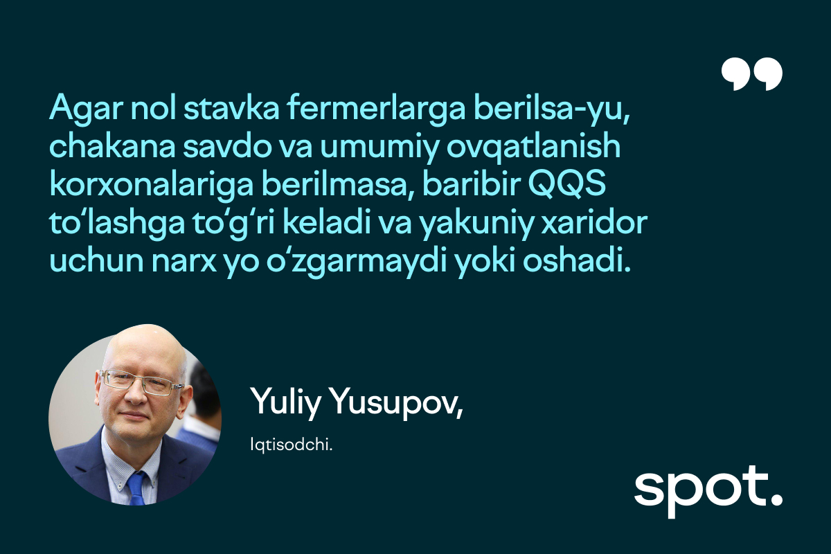 Iqtisodchi Yuliy Yusupov esa QQS stavkalarini ishlab chiqaruvchilar emas, balki butun ishlab chiqarish zanjiri bo‘yicha tovar va xizmat turlariga nisbatan tabaqalashtirish zarurligini bildirdi.