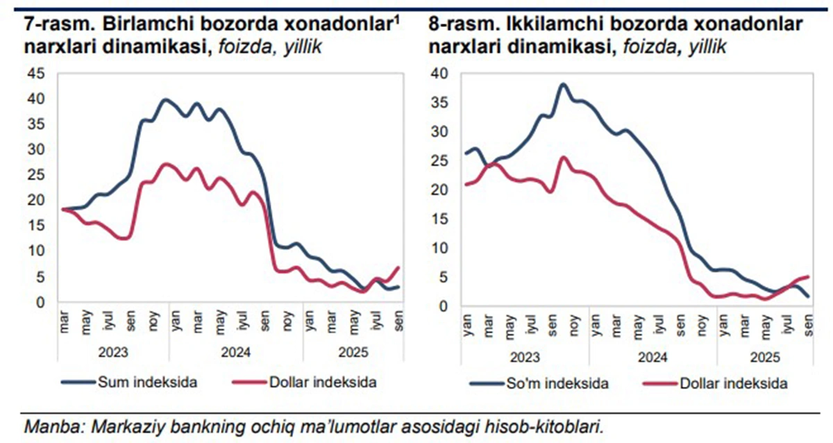 So‘m mustahkamlanishi fonida dollardagi uy-joy narxlarining yillik o‘sishi tezlashgan bo‘lsa, so‘m indeksida oldingi tendensiyalar saqlanib qoldi.