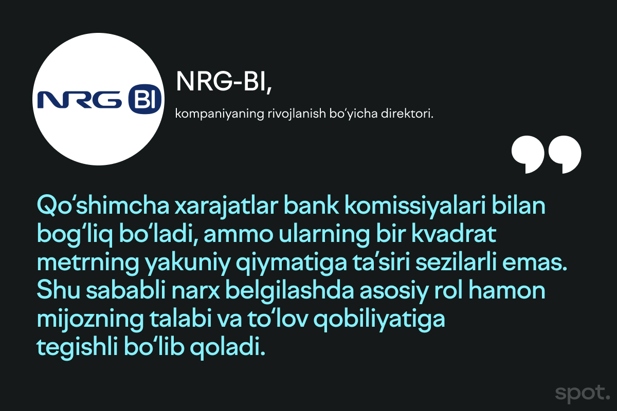NRG-BI developerlik kompaniyasi (Spot izohi: Qozog‘istonning BI Group xoldingi va O‘zbekistonning NRG developerining qo‘shma korxonasi) yirik qurilish kompaniyalari tizimli ustunlikka ega bo‘lishini ta’kidlaydi, chunki ular hozirdanoq naqd pulsiz savdo sharoitida faoliyat yuritadi. Kompaniya izohiga ko‘ra: