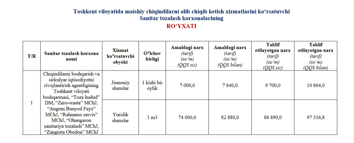 Qarorga ko‘ra, fuqarolar uchun qattiq maishiy chiqindilarni olib chiqish narxi oyiga bir kishi uchun QQSsiz 9700 ming so‘m, QQS bilan 10 864 so‘mni tashkil etadi.
