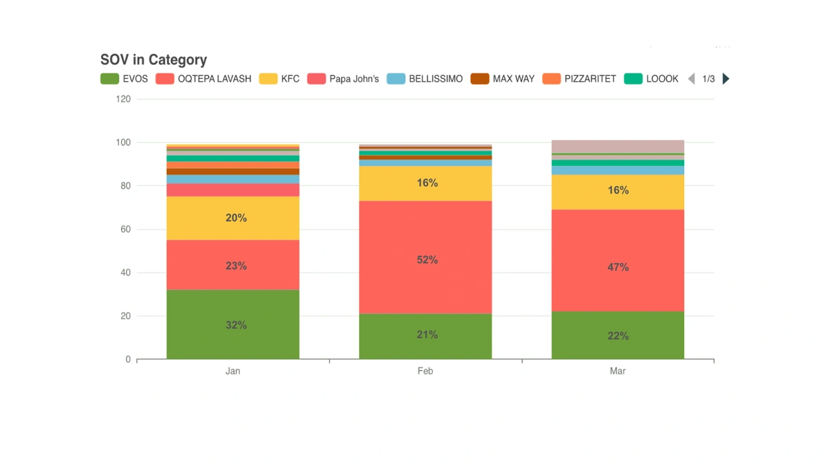 Biroq 2025-yildan boshlab bu holat o‘zgara boshladi. Tashqi reklama monitoringi ma’lumotlari Oqtepa Lavash brendi sezilarli darajada kuchayganini ko‘rsatmoqda. 2026-yilning boshida ushbu brend nafaqat yetakchilarga yaqinlashdi, balki tashqi reklamadagi ovoz ulushi (Share of Voice) bo‘yicha birinchi o‘ringa chiqib oldi.