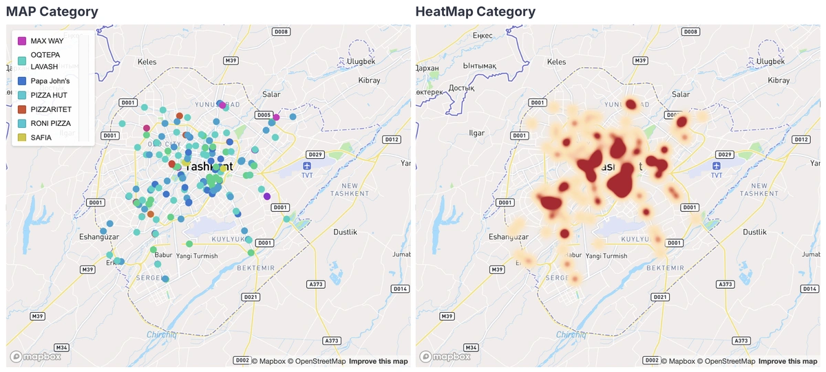 Buni xarita darajasida ham yaqqol ko‘rish mumkin. Chapda — Oqtepa Lavash joylashuvlarining haqiqiy geografiyasi, o‘ngda — butun fast food kategoriyasining issiqlik xaritasi (heatmap), ya’ni brendlar umumiy hisobda ko‘p inventar sotib oladigan nuqtalar. O‘zaro solishtiruv shuni ko‘rsatadiki, Oqtepa Lavash manzillari tasodifiy emas, balki aynan kategoriya bo‘yicha talab yuqori bo‘lgan asosiy zonalarda joylashgan.