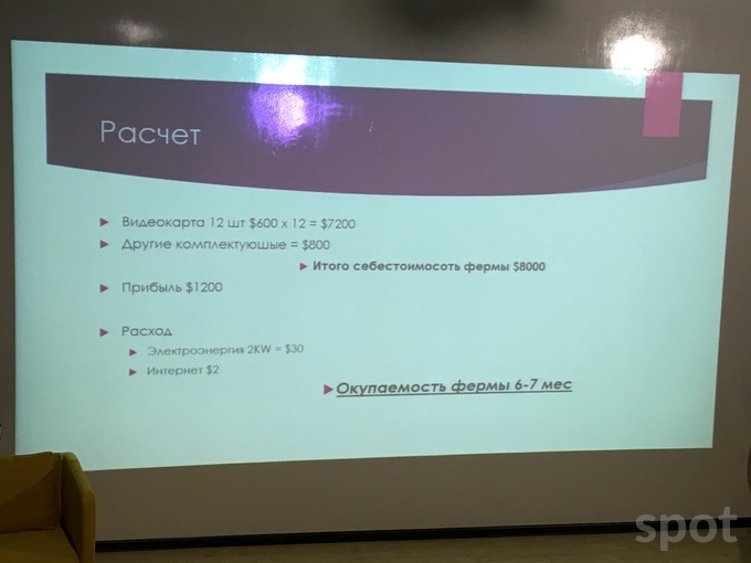 11:00. Если вдруг не видно: себестоимость фермы 8000 долларов, окупаемость 6−7 месяцев.