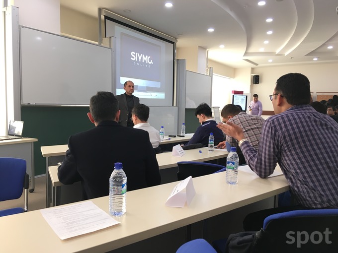 10:12. Выступает Диер Мирзаахмедов, председатель Ассоциации предприятий «Национальный маркетинговый центр». Рассказывает про Siymo Online.