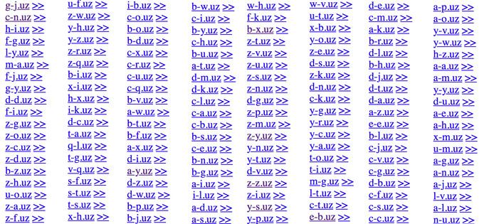 Все домены состоят из трех символов с дефисом посередине: a-x.uz, c-u.uz, c-m.uz, y-r.uz, u-t.uz, v-q.uz и так далее: