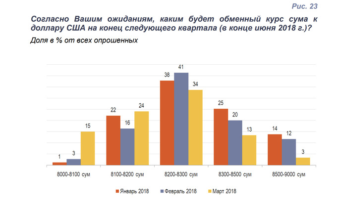 Большая часть опрошенных Центральный банком считают, что курс доллара в Узбекистана к концу июня будет на отметке в 8200—8300 сумов. Это следует из отчета Центрального банка «Инфляционные ожидания населения и предприятий Республики Узбекистан в I квартале 2018 года».