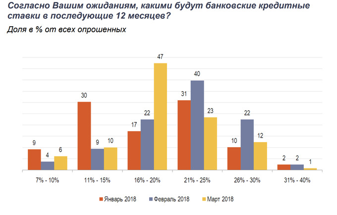 Большинство из опрошенных Центральным банком респондентов в марте ответили, что в следующие 12 месяцев ожидают банковские кредитные ставки на уровне 16% — 20%, следует из отчета Центрального банка «Инфляционные ожидания населения и предприятий Республики Узбекистан в I квартале 2018 года».
