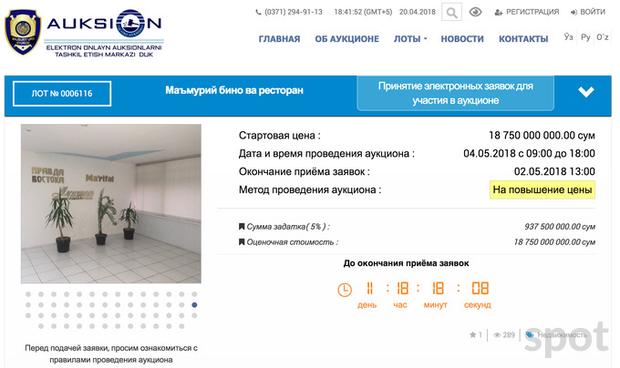 На продажу выставлено не только само здание, но и ресторан при нем. Стартовая цена объекта — 18,7 млрд сумов. Сумма задатка — 937 млн сумов.