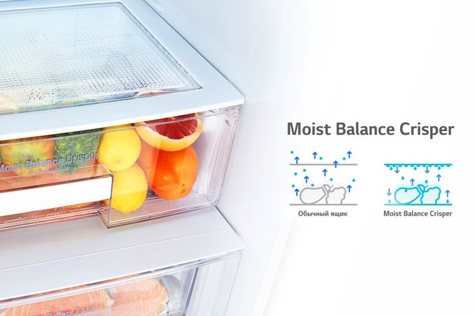 В холодильниках LG имеется специальная зона Moist Balance Crisper, которая поддерживает оптимальный баланс влажности. Благодаря ячеистой структуре крышки конденсат накапливается в сотах, предотвращая попадание капель на продукты. В то же время вода медленно испаряется, создавая оптимальную влажность. Это позволяет сохранить фрукты и овощи гораздо дольше при сохранении их полезных свойств и вкусовых качеств.