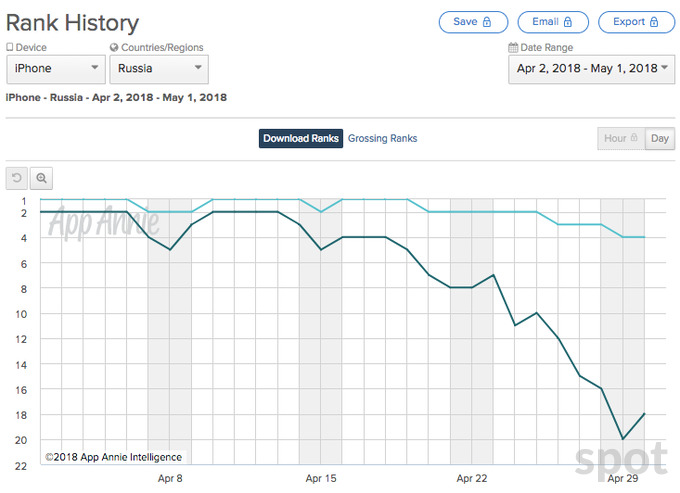 Динамика загрузок Telegram в России пользователями iOS. Источник: App Annie