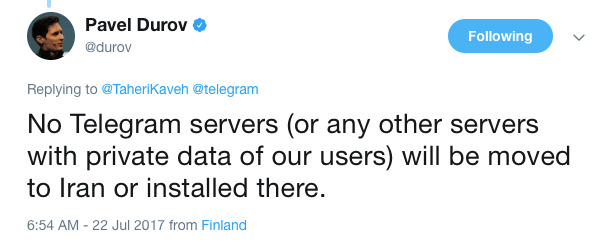 Ответ Павла Дурова на вопрос о переносе серверов в Иран. Источник: Twitter